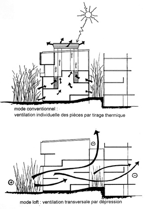 Recherche sur la mise en œuvre des moyens naturels du confort thermique dans la ville tropicale, intégrant une analyse approfondie des modèles d’habitat créole. La démarche assimile de manière itérative des données physico-climatiques, typologiques et sociales. Le mode de groupement des logements participe d’une logique de "protection solaire mutualiste". De forts gradients thermiques sont organisés à l’échelle de l’îlot, provoquant un mouvement naturel d’évacuation de l’air chaud. Le recours massif à la végétation génère un mésoclimat rafraîchit, écrin d’une architecture à la porosité finement modulable. Des cheminées solaires, associées à des typologies à patio et à niveaux décalés, assurent une ventilation naturelle performante. Les logements offrent des espaces intérieurs et extérieurs très imbriqués et des modes d’appropriation variés.