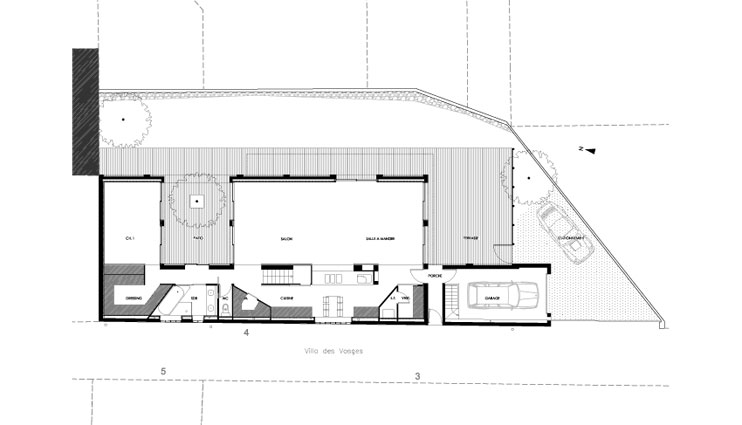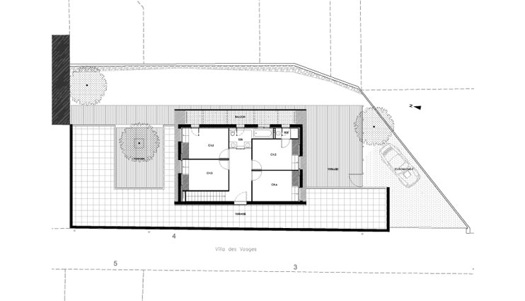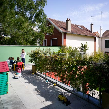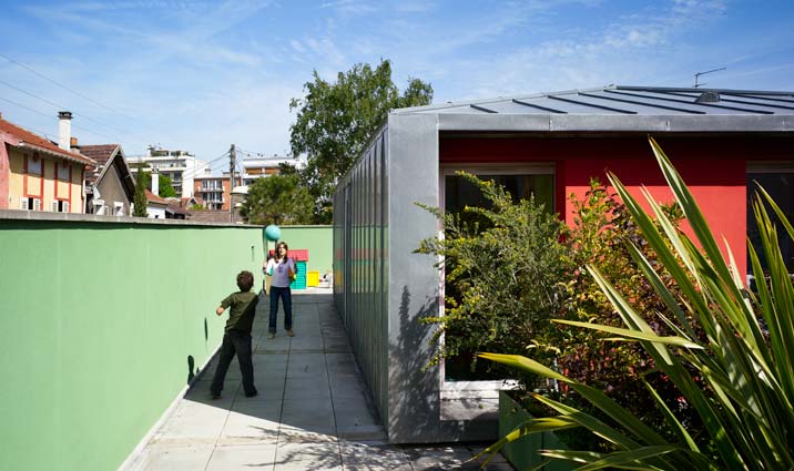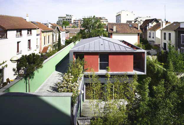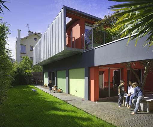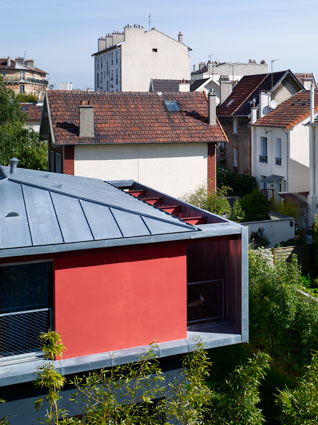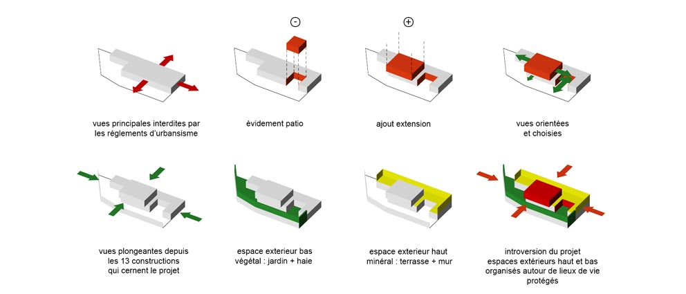 Suite à l’achat de la friche d’un ancien bâtiment d’activité, le nouveau propriétaire découvre avec consternation les limites detransformation imposées par le POS. L’appel aux architectes est lancé comme un SOS.Les contraintes réglementaires imposaient la conservation des murs et interdisait de nouvelles prises de vue sur le jardin. Afin de dénouer le problème, une double intervention sur la masse construite est alors opérée : le creusement d’un patio et l’ajout d’un volume équivalent sur le toit.Le patio apporte de la lumière et des vues‘‘ réglementaires ‘‘aux espaces du rez-de-chaussée. L’extension permet de capter de la lumière ‘‘légales‘‘ au dessus de l’existant. Et un balcon écran permet d’éclairer la façade côté jardin sans déroger à la règle.
