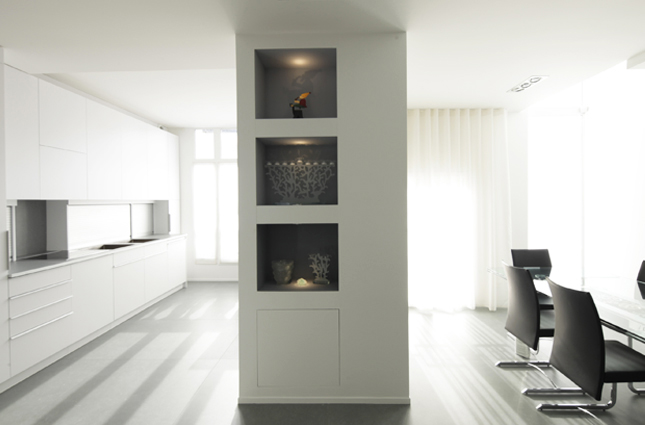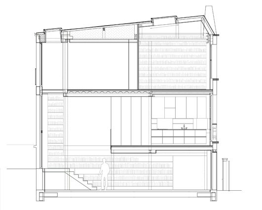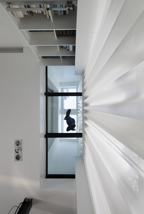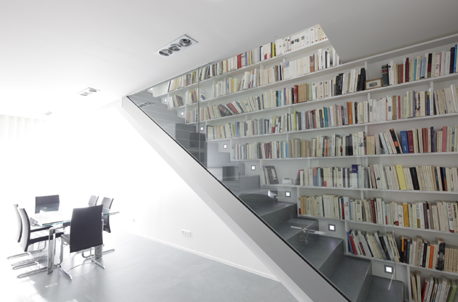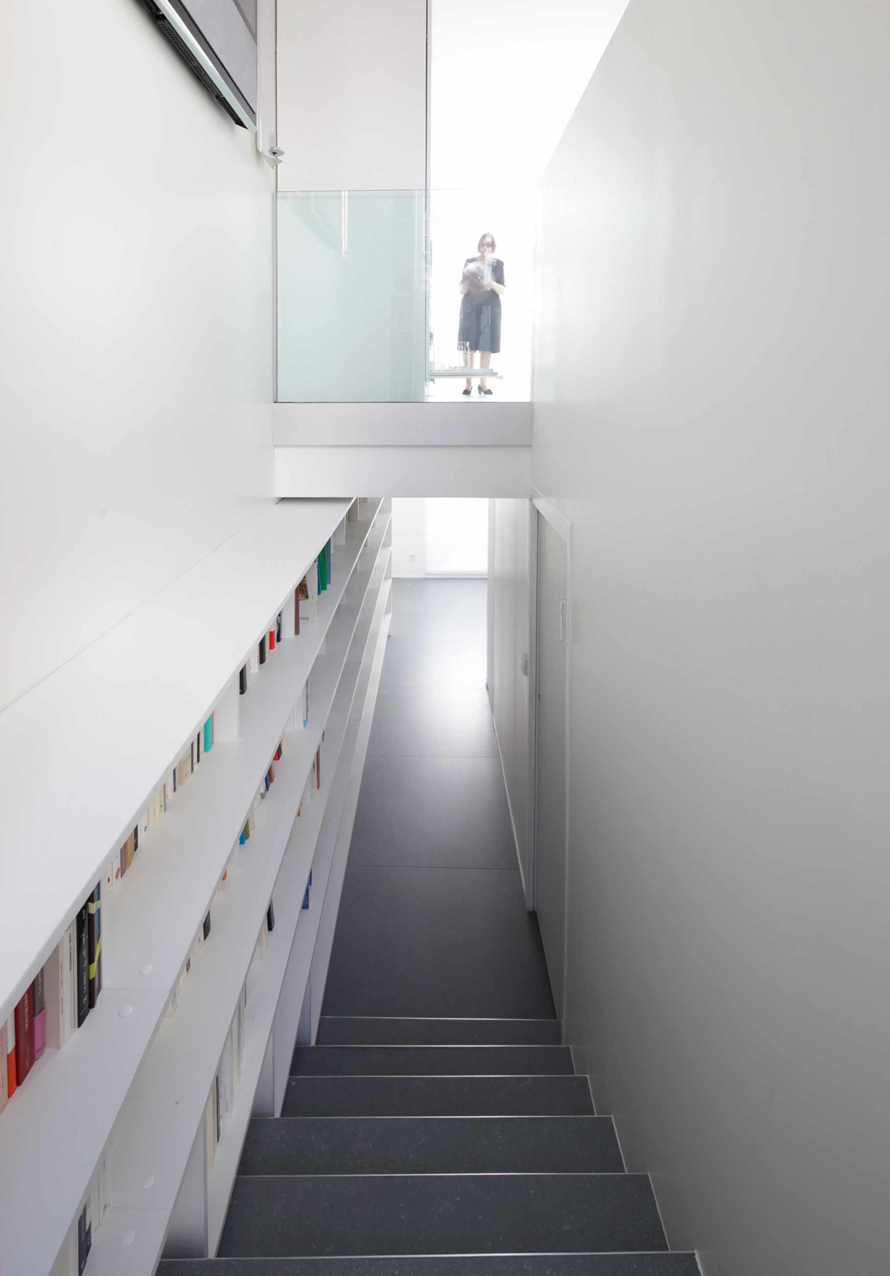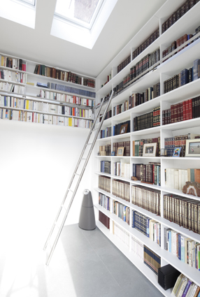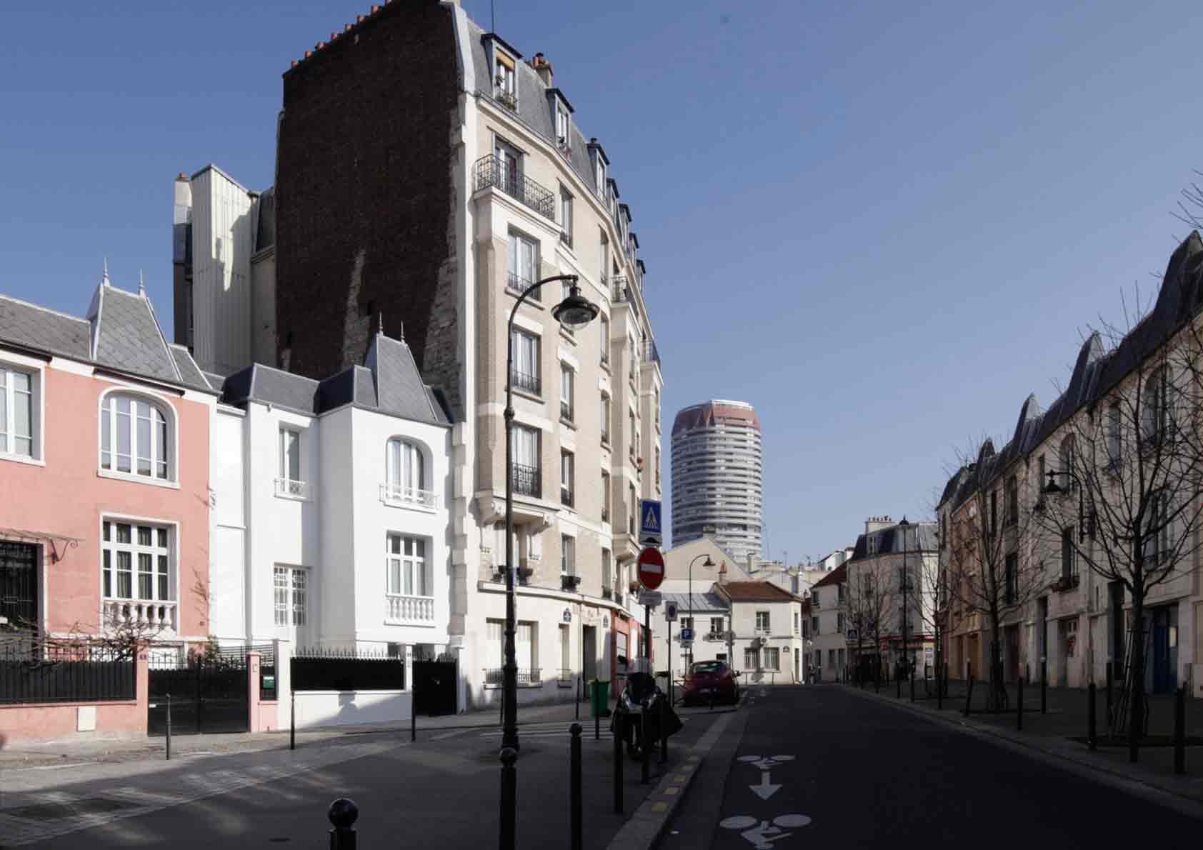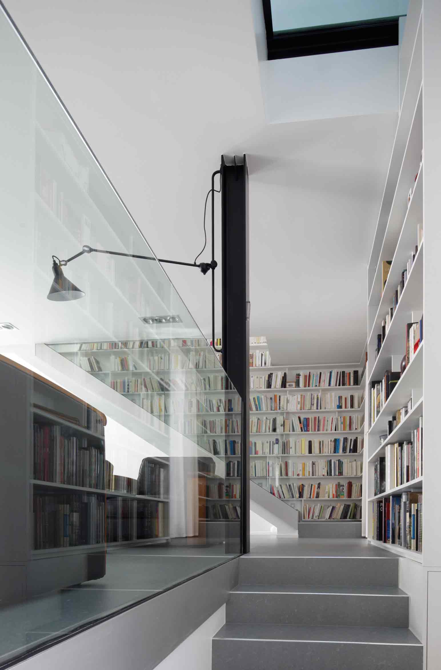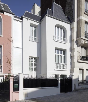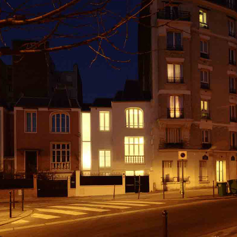 Les 44 maisons accolées de la rue Dieulafoy, dans le quartier de la Maison Blanche (13ème Arrt), ont été construites en 1921 par l’architecte Henry Trésal. Elles illustrent un cas assez rare pour l’époque, d’une promotion immobilière privée d’habitat intermédiaire à destination de la classe moyenne. Au cours du XXème siècle, la plupart des pavillons ont fait l’objet de modifications qui ont contribué à les individualiser. Le projet de rénovation consiste à restituer les caractéristiques morphologiques initiales de la façade, tout en insufflant un esprit contemporain radical. Des pans de verre sérigraphié blanc, faisant écho à la matière et à la couleur du mur maçonné originel, laissent désormais la lumière pénétrer généreusement l’intérieur. Celui-ci est totalement restructuré suivant un parcours en spirale qui lie les trois niveaux, et dont une bibliothèque de 10 000 ouvrages constitue le fil d’Ariane.