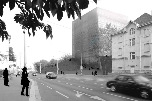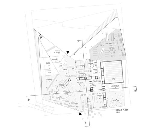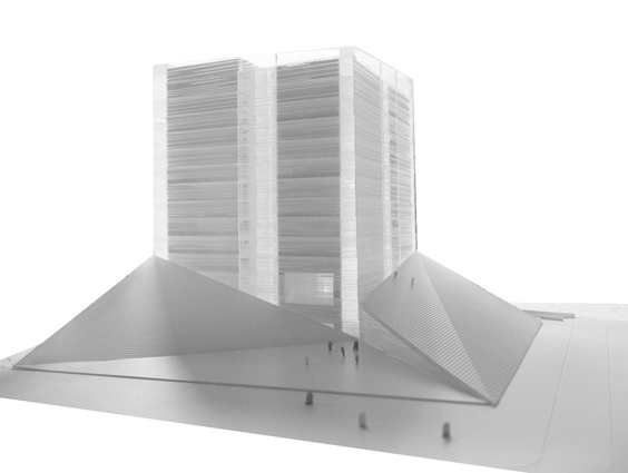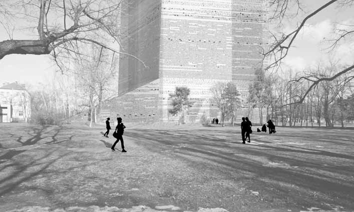 The architectural concept of the new National Library is based on highly efficient and dense archiving towers interconnected with generous spaces dedicated to Knowledge Access. It is thought out in different spaces of time: the human one, dedicated to studying and research and the one of Knowledge, counting in centuries and aiming for eternity. Volume Drama serves the expression of the knowledge layering. Strong storage towers emerge from the ground. They are fed with telluric forces, with their own dynamic: forms in progress, reaching for the sky. Completed with office towers, they form a compact building, wrapped in a computer generated code carved in a glazed double skin.