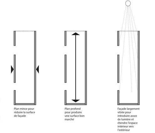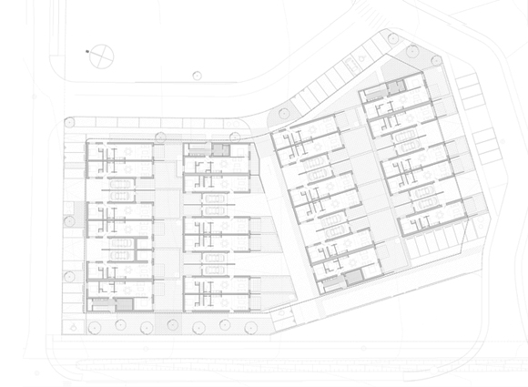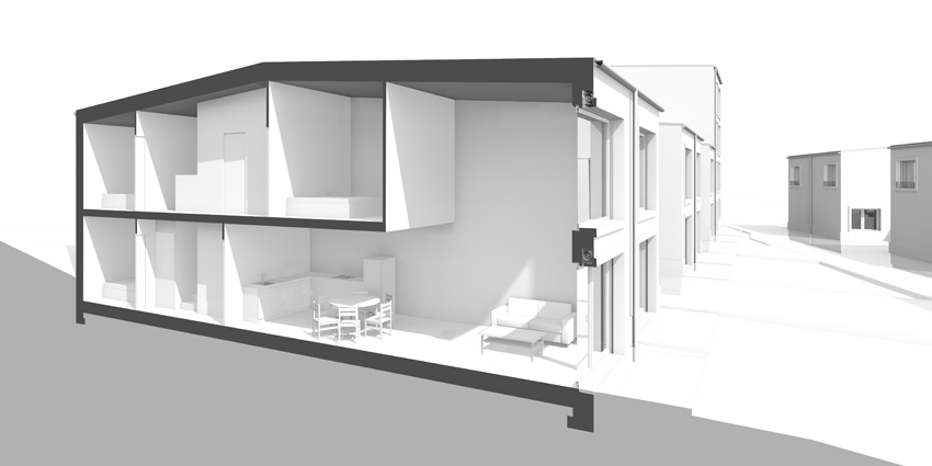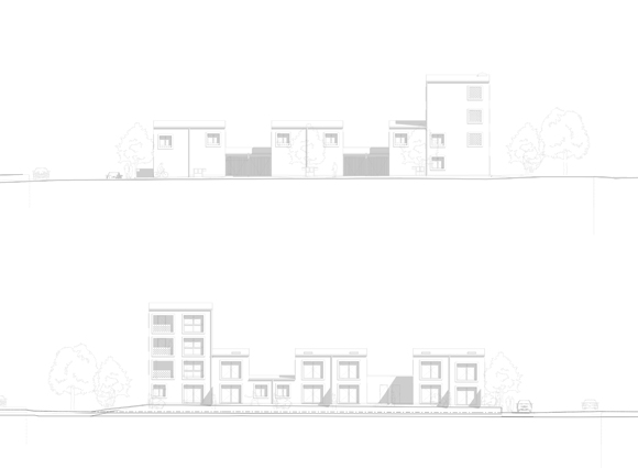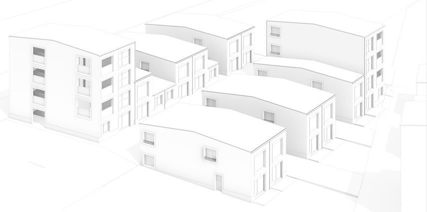 L’articulation des volumes bâtis à l’intérieur de l’opération tisse un lien entre les différentes échelles très marquées du quartier. Sans rupture, de la maison individuelle aux petits collectifs. Les constructions sont proposées avec une densité mesurée afin de ménager la plus grande continuité possible du Bois à l’intérieur du quartier, et de constituer un axe paysager unifiant riche de séquences aux ambiances variées. Combinant les logements entre eux, tout en préservant l’intimité familiale de chacun, les typologies sont basées sur la volonté de proposer de la qualité dans les séquences du plan, le volume et la lumière. Les petits immeubles R+3 apparaissent comme des signes marquant du nouveau quartier, mais ne sont jamais des obstacles à la vue lointaine sur le paysage. Positionnés en alternance à chaque extrémité des bandes de maisons, ils ne génèrent jamais d’obstacle ou d’ombres portées sur les maisons.